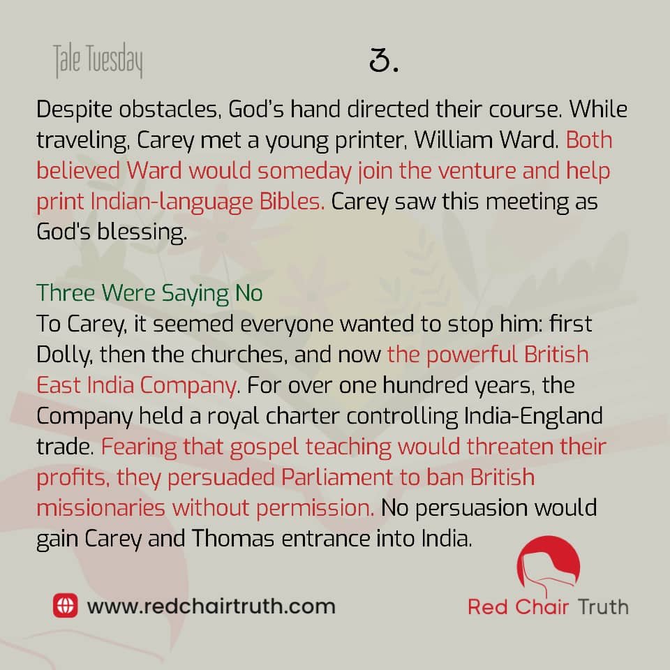 To Carey, it seemed everyone wanted to stop him: first Dolly, then the churches, and now the powerful British East India Company.
