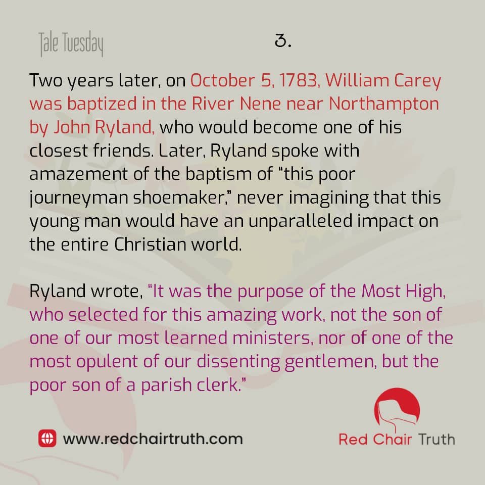 Two years later, on October 5, 1783, William Carey was baptized in the River Nene near Northampton by John Ryland, who would become one of his closest friends. Later, Ryland spoke with amazement of the baptism of “this poor journeyman shoemaker,” never imagining that this young man would have an unparalleled impact on the entire Christian world.