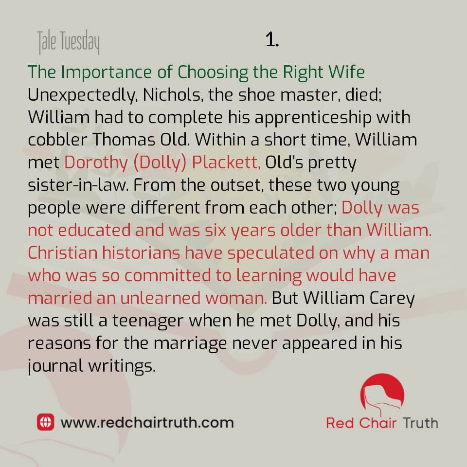 Unexpectedly, Nichols, the shoe master, died; William had to complete his apprenticeship with cobbler Thomas Old. Within a short time, William met Dorothy (Dolly) Plackett, Old’s pretty sister-in-law. From the outset, these two young people were different from each other; Dolly was not educated and was six years older than William. Christian historians have speculated on why a man who was so committed to learning would have married an unlearned woman. But William Carey was still a teenager when he met Dolly, and his reasons for the marriage never appeared in his journal writings.