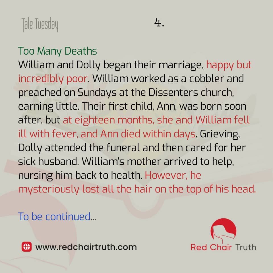 William and Dolly began their marriage, happy but incredibly poor. William worked as a cobbler and preached on Sundays at the Dissenters church, earning little. Their first child, Ann, was born soon after, but at eighteen months, she and William fell ill with fever, and Ann died within days. Grieving, Dolly attended the funeral and then cared for her sick husband. William’s mother arrived to help, nursing him back to health. However, he mysteriously lost all the hair on the top of his head.