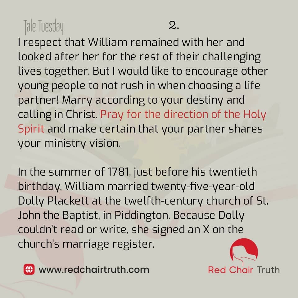 I respect that William remained with her and looked after her for the rest of their challenging lives together. But I would like to encourage other young people to not rush in when choosing a life partner! Marry according to your destiny and calling in Christ. Pray for the direction of the Holy Spirit and make certain that your partner shares your ministry vision.
