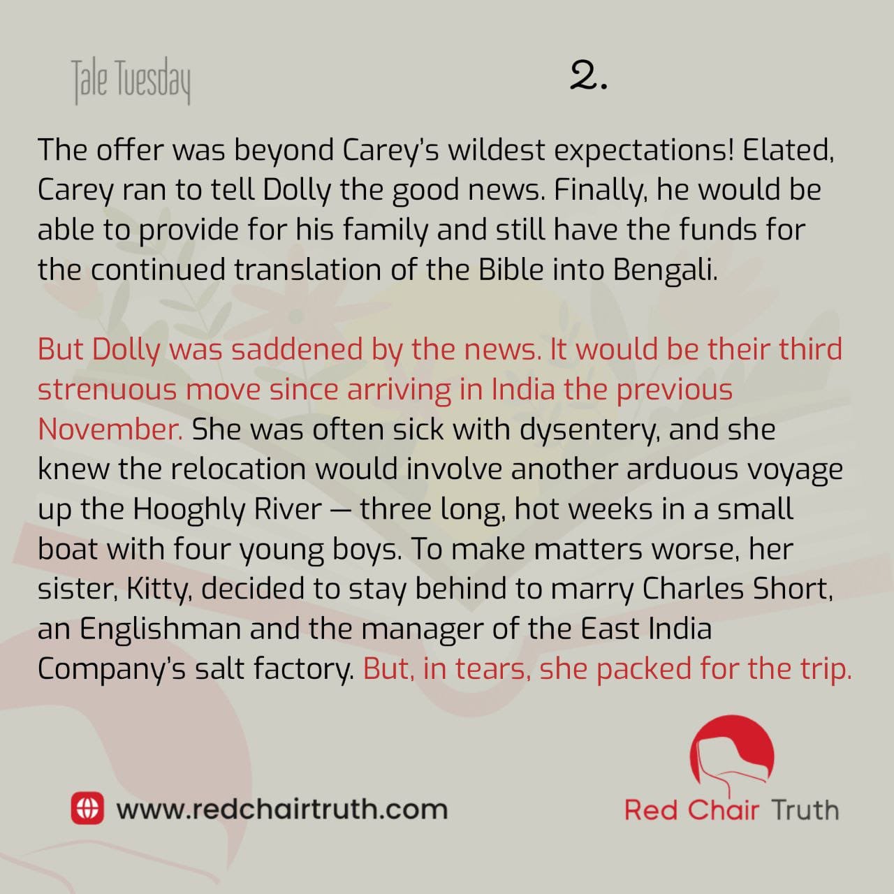 Dolly was saddened by the news. It would be their third strenuous move since arriving in India. She was often sick with dysentery, and the relocation involved a three-week, hot voyage up the Hooghly River with four young boys.