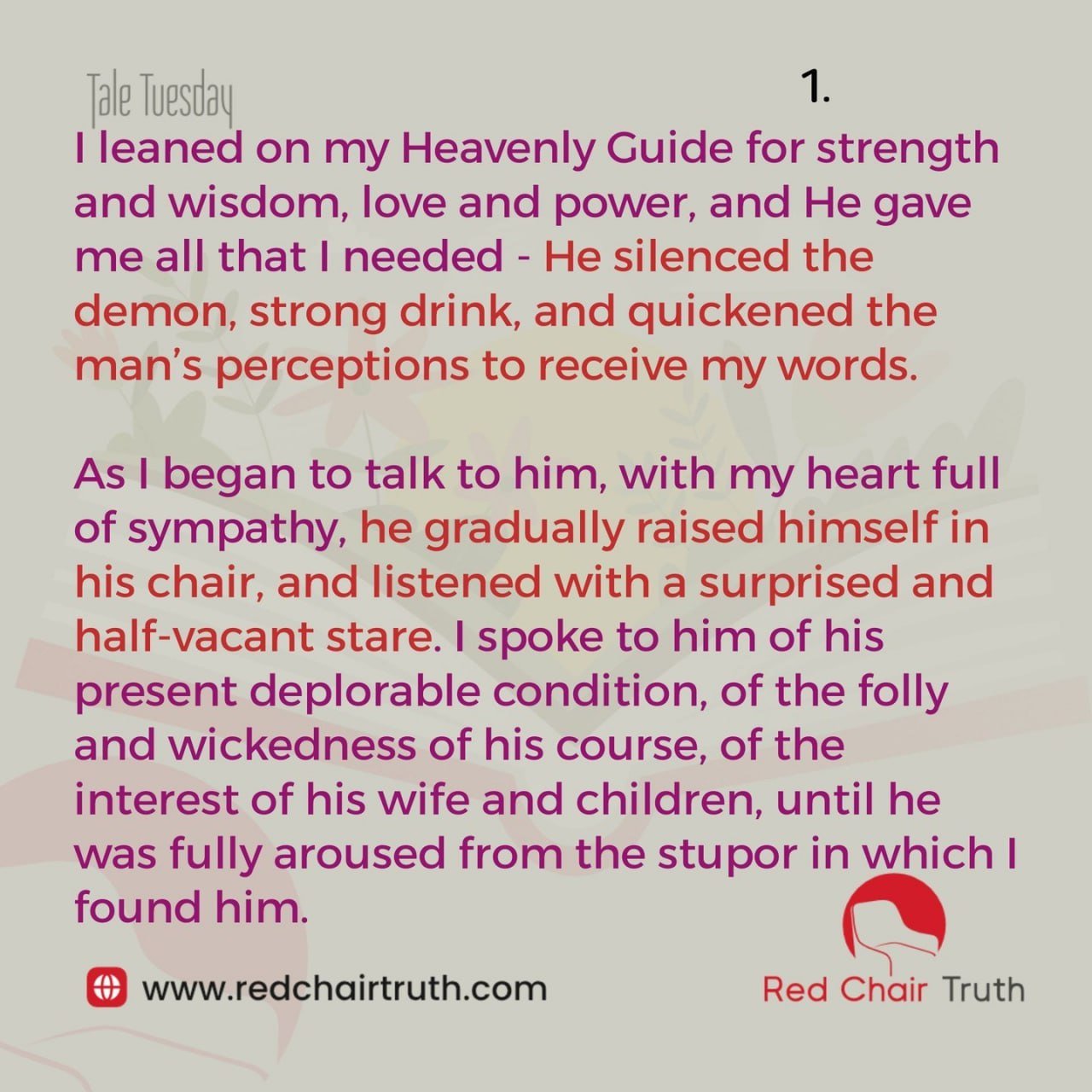 I leaned on my Heavenly Guide for strength and wisdom, love and power, and He gave me all that I needed—He silenced the demon, strong drink, and quickened the man’s perceptions to receive my words. As I began to talk to him, with my heart full of sympathy, he gradually raised himself in his chair, and listened with a surprised and half-vacant stare. I spoke to him of his present deplorable condition, of the folly and wickedness of his course, of the interest of his wife and children, until he was fully aroused from the stupor in which I found him.