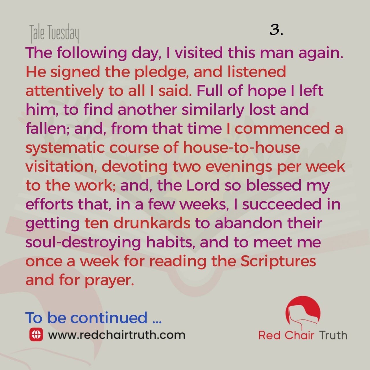 The following day, I visited this man again. He signed the pledge, and listened attentively to all I said. Full of hope I left him, to find another similarly lost and fallen; and, from that time I commenced a systematic course of house-to-house visitation, devoting two evenings per week to the work; and, the Lord so blessed my efforts that, in a few weeks, I succeeded in getting ten drunkards to abandon their soul-destroying habits, and to meet me once a week for reading the Scriptures and for prayer.