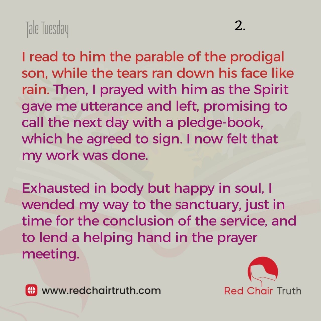 I read to him the parable of the prodigal son, while the tears ran down his face like rain. Then, I prayed with him as the Spirit gave me utterance and left, promising to call the next day with a pledge-book, which he agreed to sign. I now felt that my work was done. Exhausted in body but happy in soul, I wended my way to the sanctuary, just in time for the conclusion of the service, and to lend a helping hand in the prayer meeting.