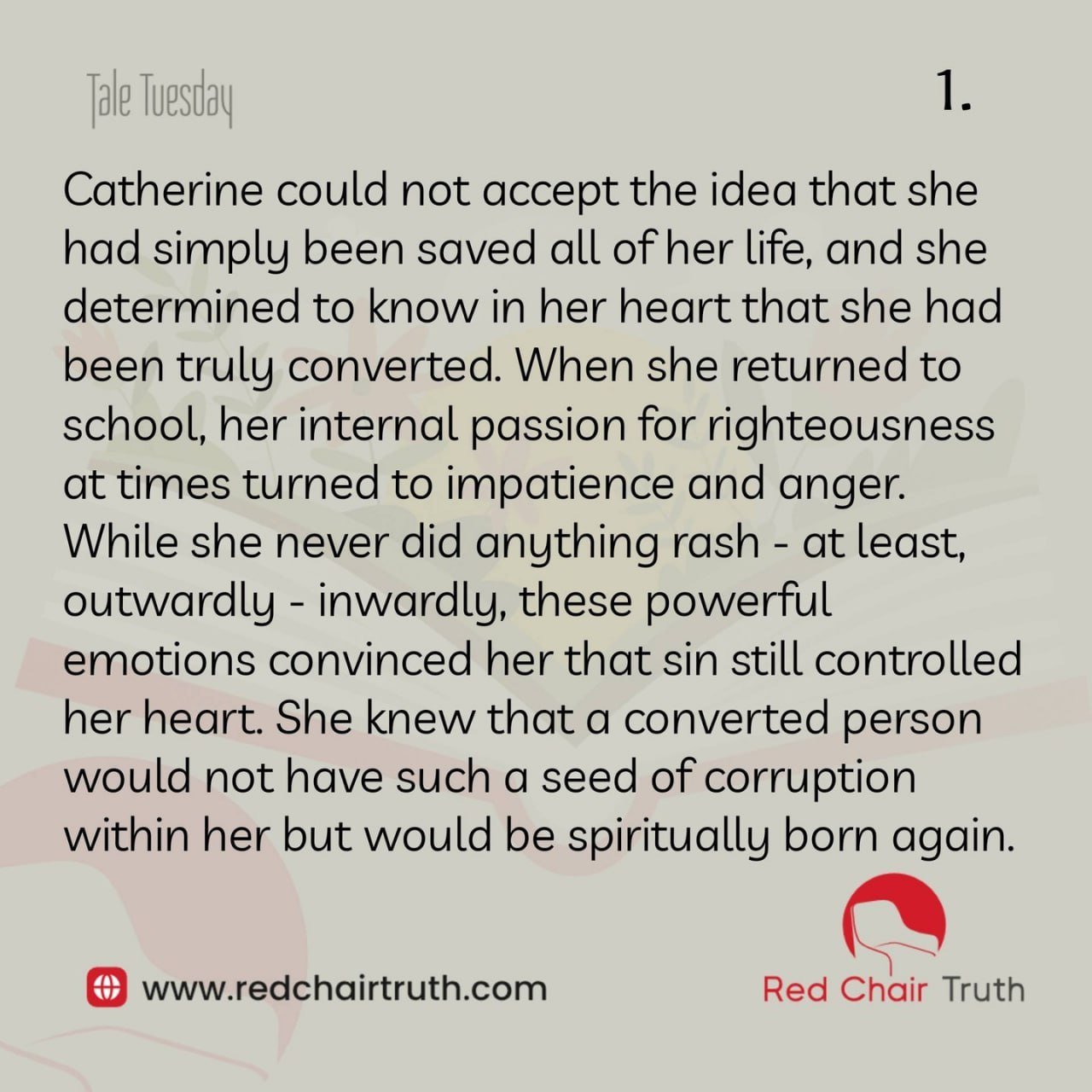 Catherine could not accept the idea that she had simply been saved all of her life, and she determined to know in her heart that she had been truly converted. When she returned to school, her internal passion for righteousness at times turned to impatience and anger. While she never did anything rash at least outwardly inwardly, these powerful emotions convinced her that sin still controlled her heart. She knew that a converted person would not have such a seed of corruption within her but would be spiritually born again.