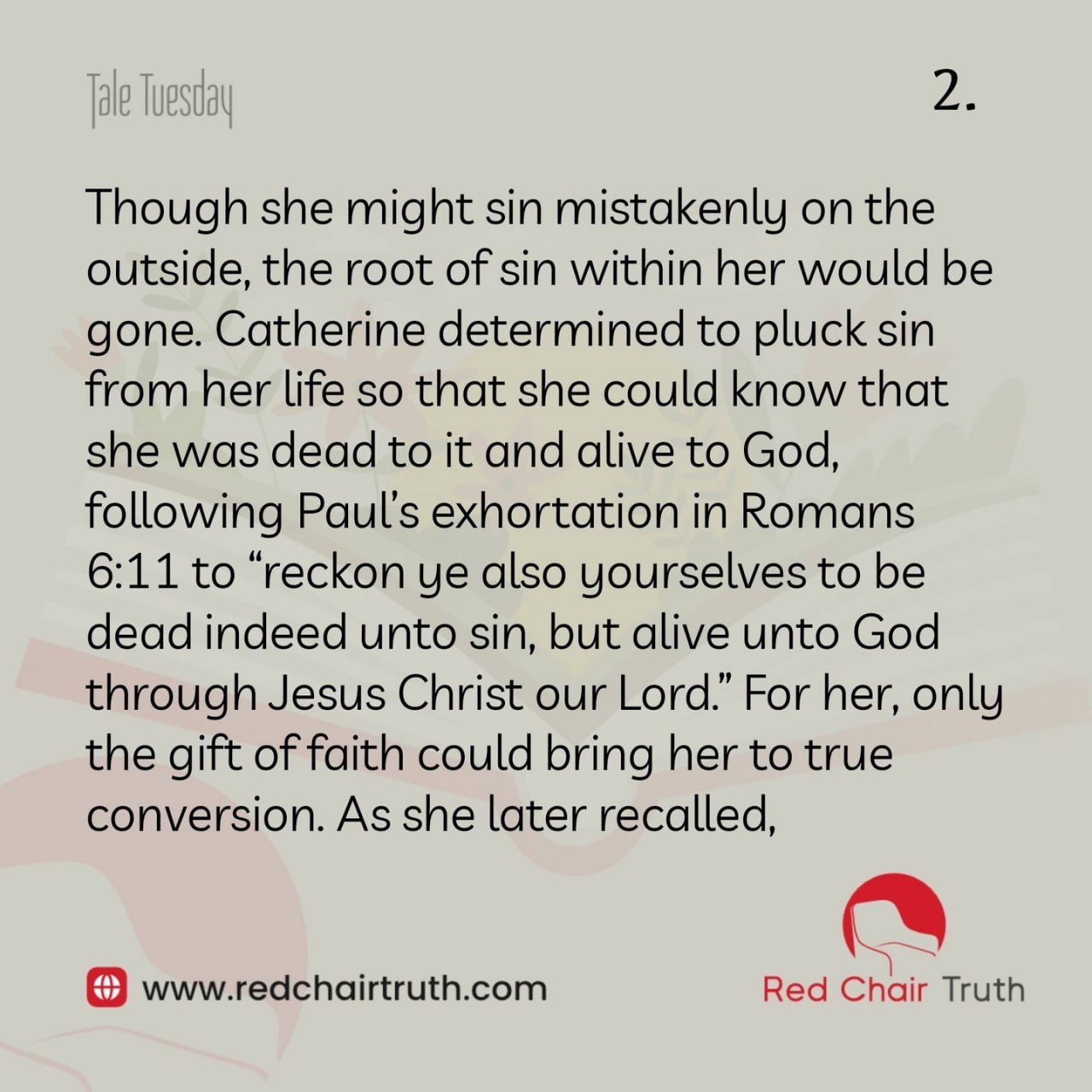 Though she might sin mistakenly on the outside, the root of sin within her would be gone. Catherine determined to pluck sin from her life so that she could know that she was dead to it and alive to God, following Paul’s exhortation in Romans 6:11 to “reckon ye also yourselves to be dead indeed unto sin, but alive unto God through Jesus Christ our Lord.” For her, only the gift of faith could bring her to true conversion. As she later recalled,