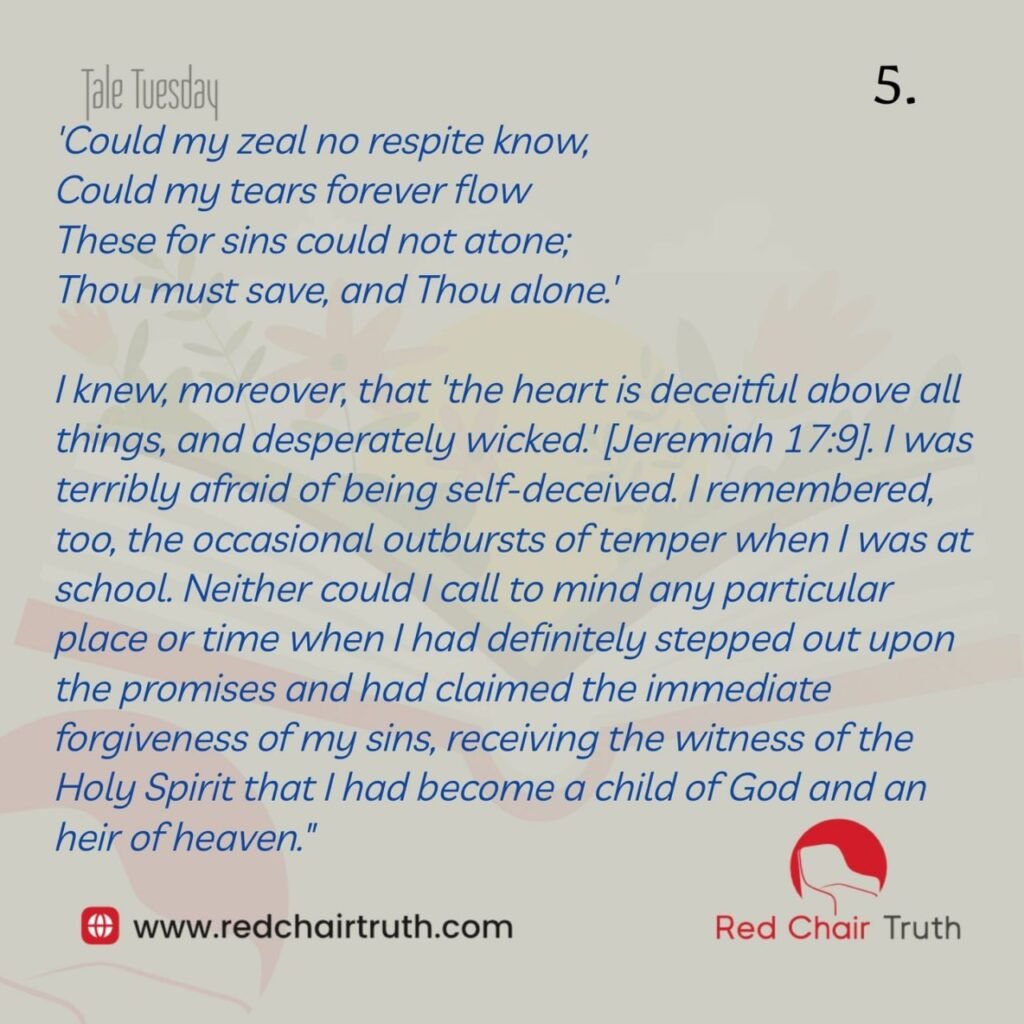 I knew, moreover, that ‘the heart is deceitful above all things, and desperately wicked.’ [Jeremiah 17:9]. I was terribly afraid of being self deceived. I remembered, too, the occasional outbursts of temper when I was at school. Neither could I call to mind any particular place or time when I had definitely stepped out upon the promises and had claimed the immediate forgiveness of my sins, receiving the witness of the Holy Spirit that I had become a child of God and an heir of heaven.”