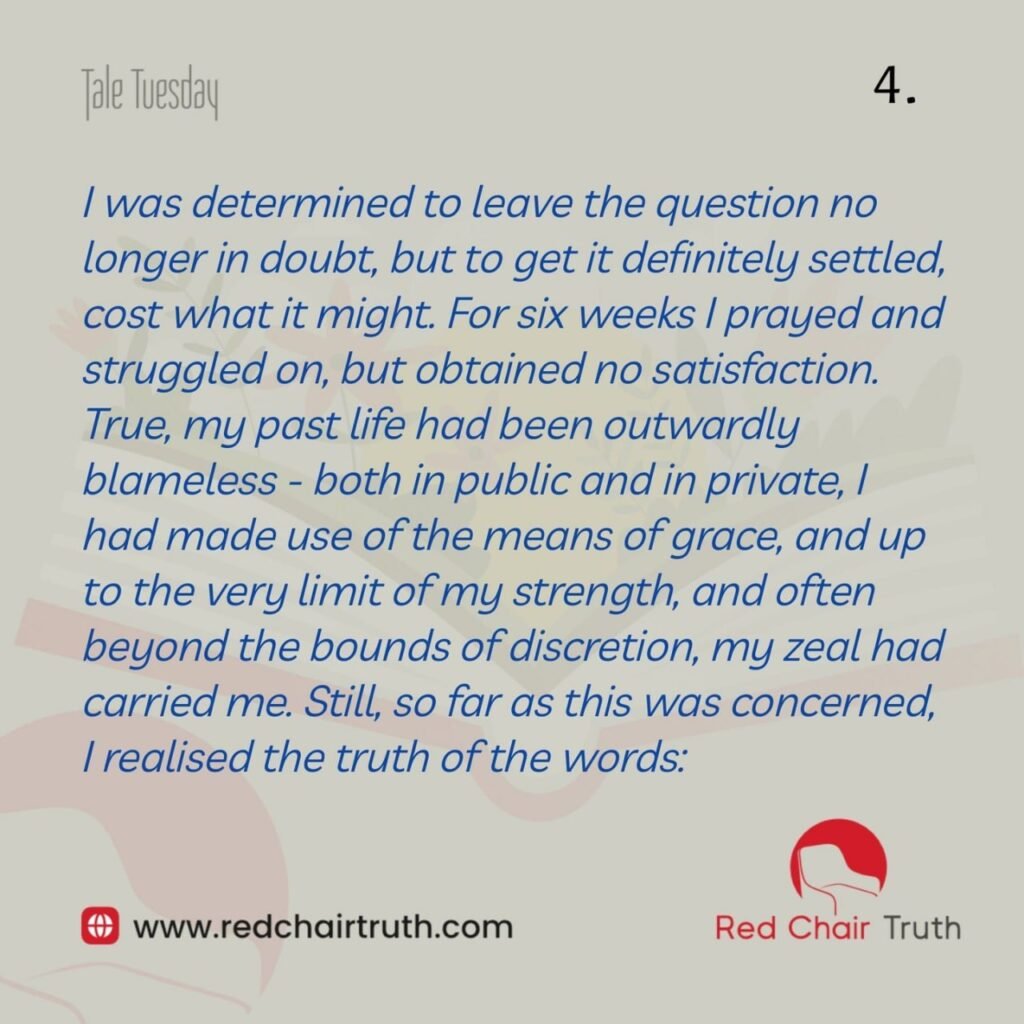 “About this time I passed through a great controversy of soul. Although I was conscious of having given myself up fully to God from my earliest years; and, although I was anxious to serve Him and often realised deep enjoyment in prayer, nevertheless, I had not the positive assurance that my sins were forgiven, and that I had experienced the actual change of heart about which I had read and heard so much.