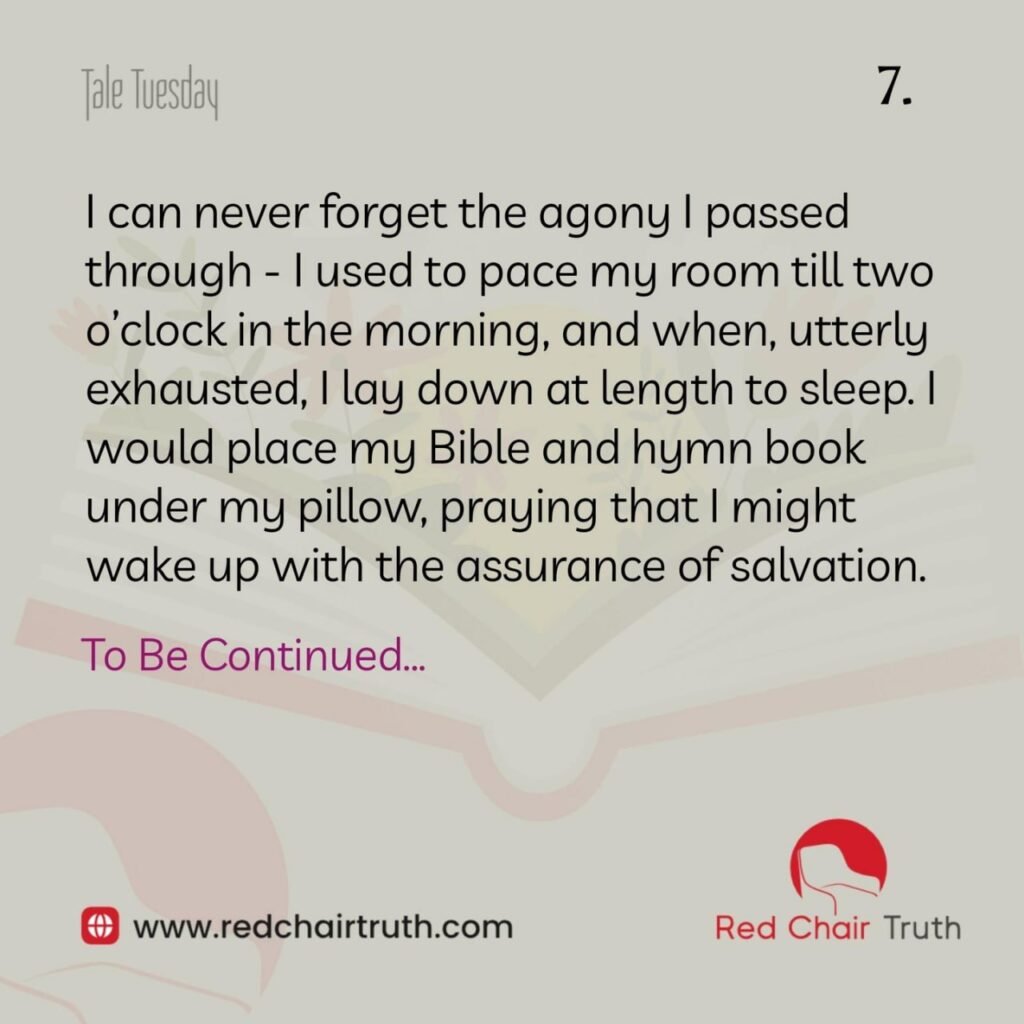 I can never forget the agony I passed through I used to pace my room till two o’clock in the morning, and when, utterly exhausted, I lay down at length to sleep. I would place my Bible and hymn book under my pillow, praying that I might wake up with the assurance of salvation.