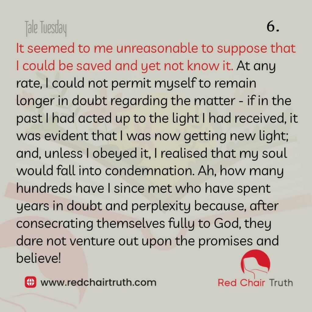It seemed to me unreasonable to suppose that I could be saved and yet not know it. At any rate, I could not permit myself to remain longer in doubt regarding the matter if in the past I had acted up to the light I had received, it was evident that I was now getting new light; and, unless I obeyed it, I realised that my soul would fall into condemnation. Ah, how many hundreds have I since met who have spent years in doubt and perplexity because, after consecrating themselves fully to God, they dare not venture out upon the promises and believe.
