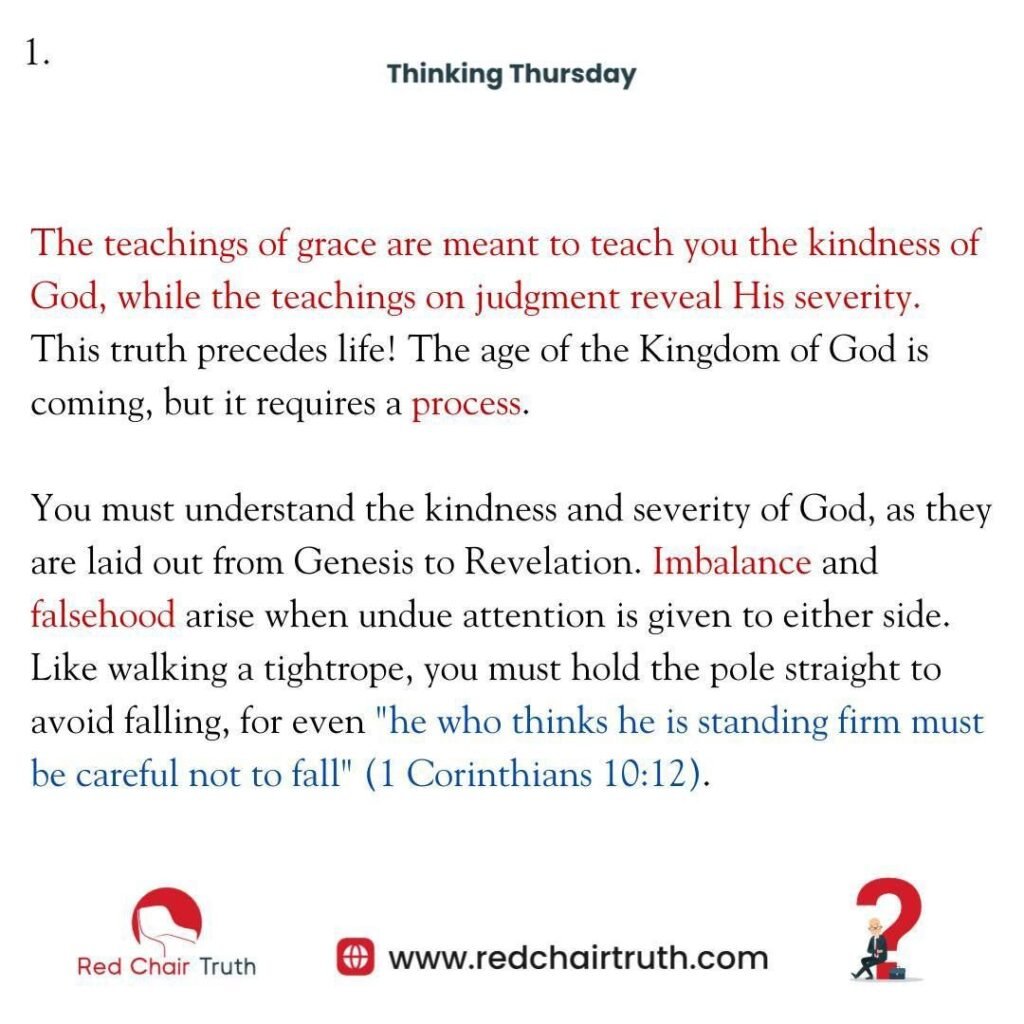 You must understand the kindness and severity of God, as they are laid out from Genesis to Revelation. Imbalance and falsehood arise when undue attention is given to either side. Like walking a tightrope, you must hold the pole straight to avoid falling, for even “he who thinks he is standing firm must be careful not to fall” (1 Corinthians 10:12).