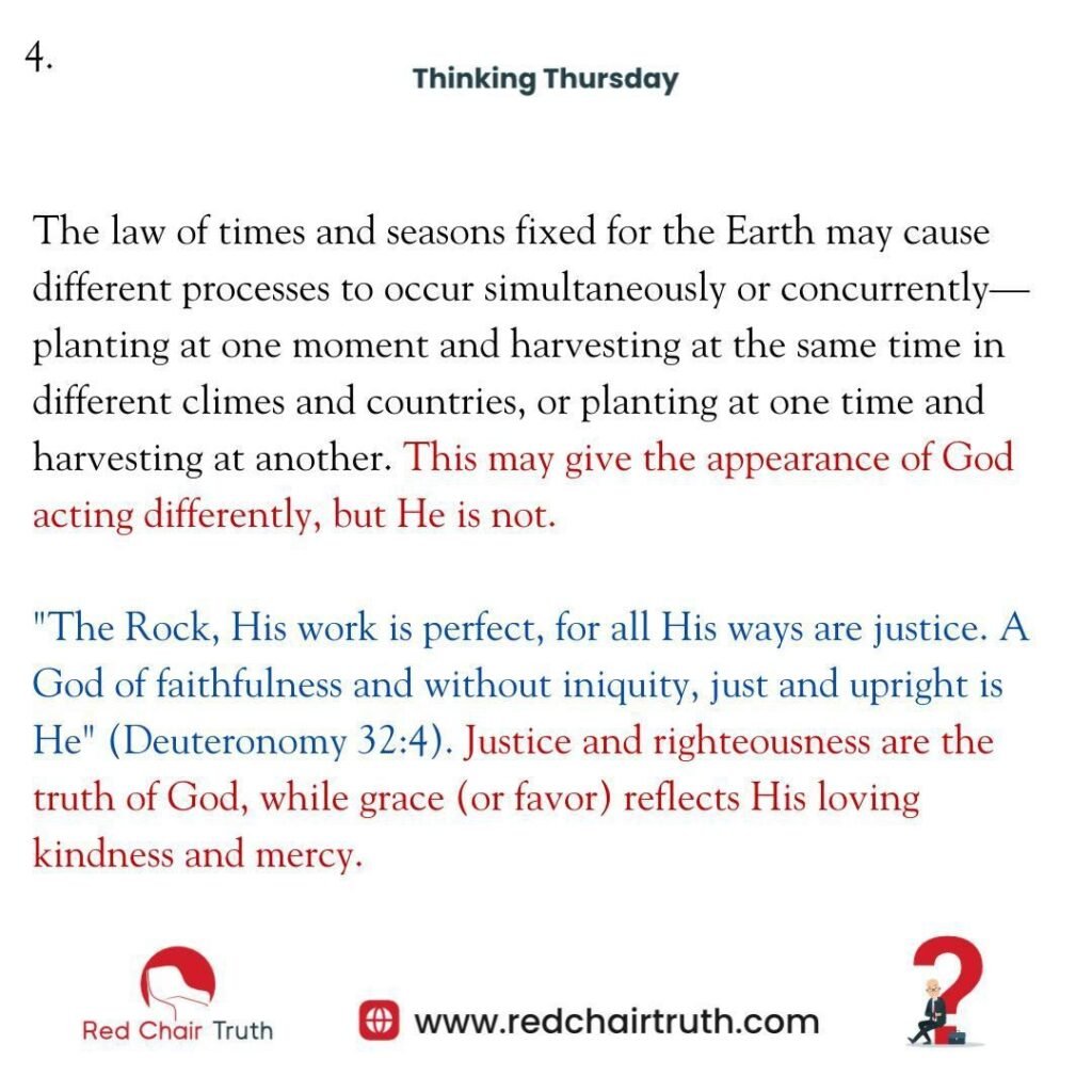 The law of times and seasons fixed for the Earth may cause different processes to occur simultaneously or concurrently—planting at one moment and harvesting at the same time in different climes and countries, or planting at one time and harvesting at another. This may give the appearance of God acting differently, but He is not.