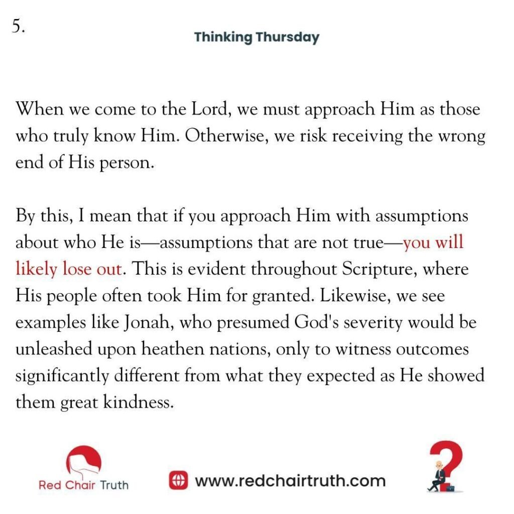 By this, I mean that if you approach Him with assumptions about who He is—assumptions that are not true—you will likely lose out. This is evident throughout Scripture, where His people often took Him for granted. Likewise, we see examples like Jonah, who presumed God’s severity would be unleashed upon heathen nations, only to witness outcomes significantly different from what they expected as He showed them great kindness.