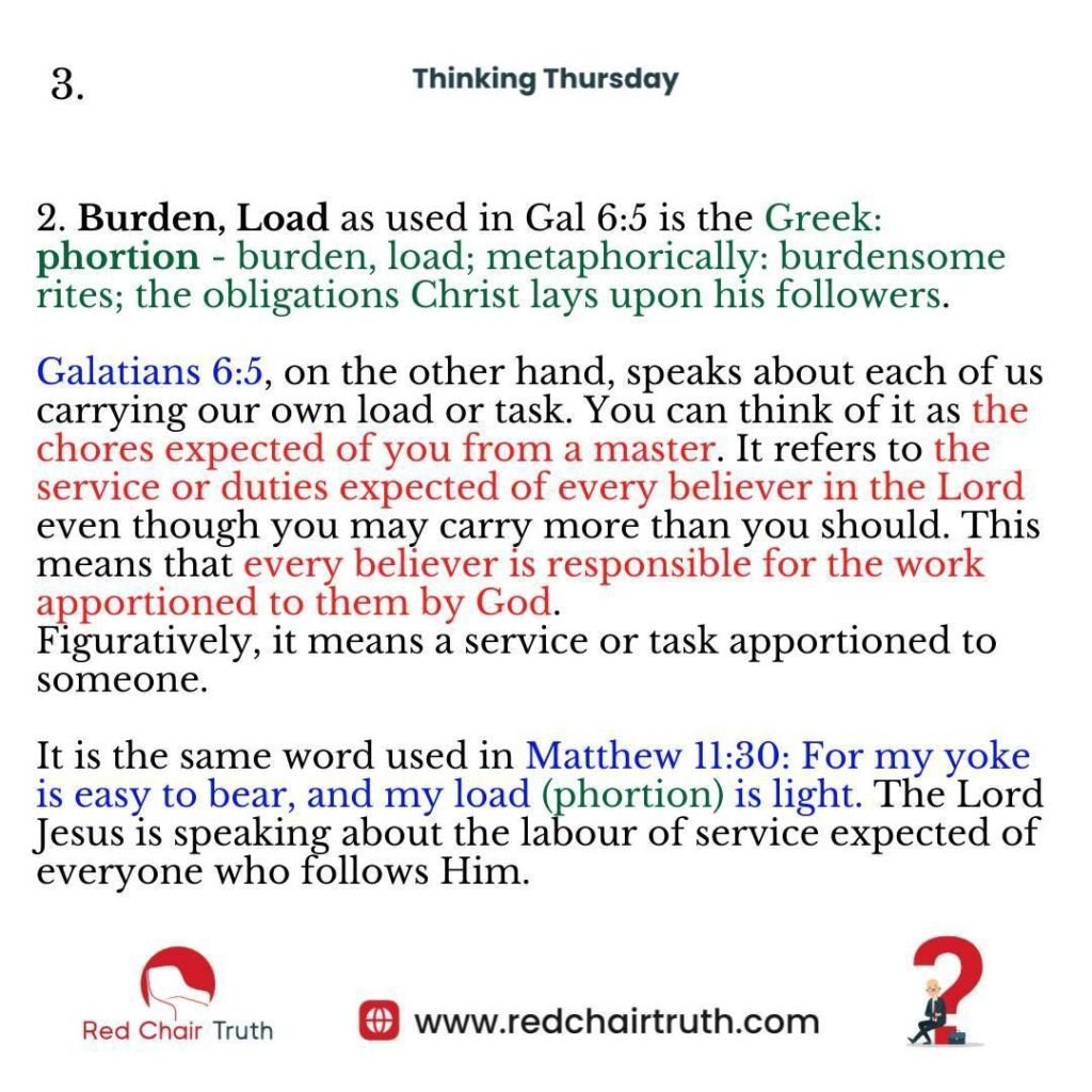 2. Burden, Load as used in Gal 6:5 is the Greek: phortion – burden, load; metaphorically: burdensome rites; the obligations Christ lays upon his followers.