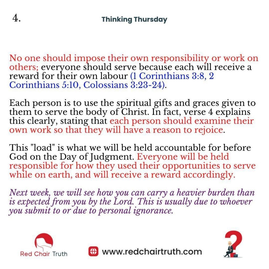 No one should impose their own responsibility or work on others; everyone should serve because each will receive a reward for their own labour (1 Corinthians 3:8, 2 Corinthians 5:10, Colossians 3:23-24).