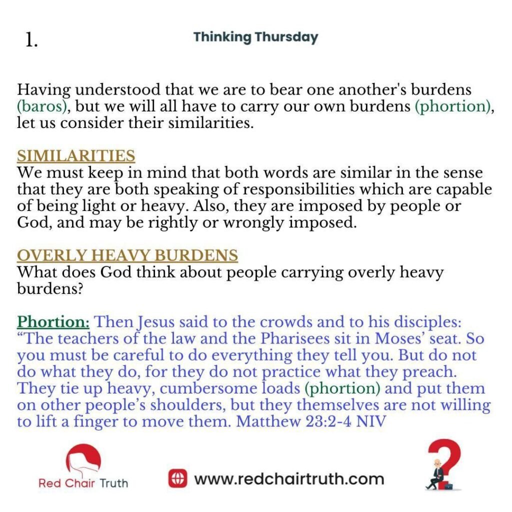 Having understood that we are to bear one another’s burdens (baros), but we will all have to carry our own burdens (phortion), let us consider their similarities.