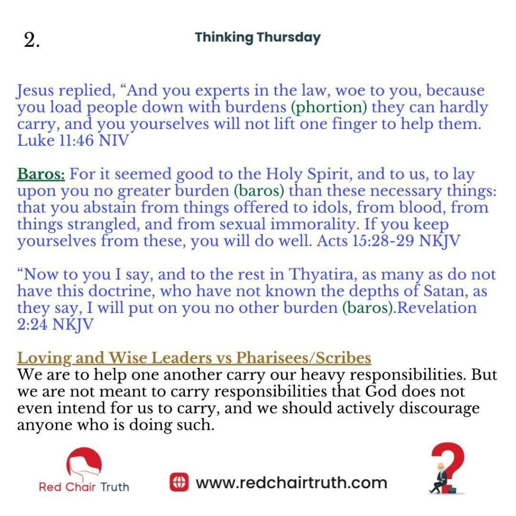 Examples of bearing responsibilities not given by the Lord is people doing difficult spiritual ‘assignments’, starving yourself in the name of fasting, flagellation (self scourging), and otherwise tormenting your flesh. Colossians 2:20-23, Galatians 4:9-11, Matthew 15:9-20 and Matthew 23:1-4, talk about things that have no value. Legalistic Christians (especially when leaders), create burdens that are not necessary. It is important to understand that these are not the kinds of burdens that God meant us to bear. Good and godly leadership is of great value against false burdens.