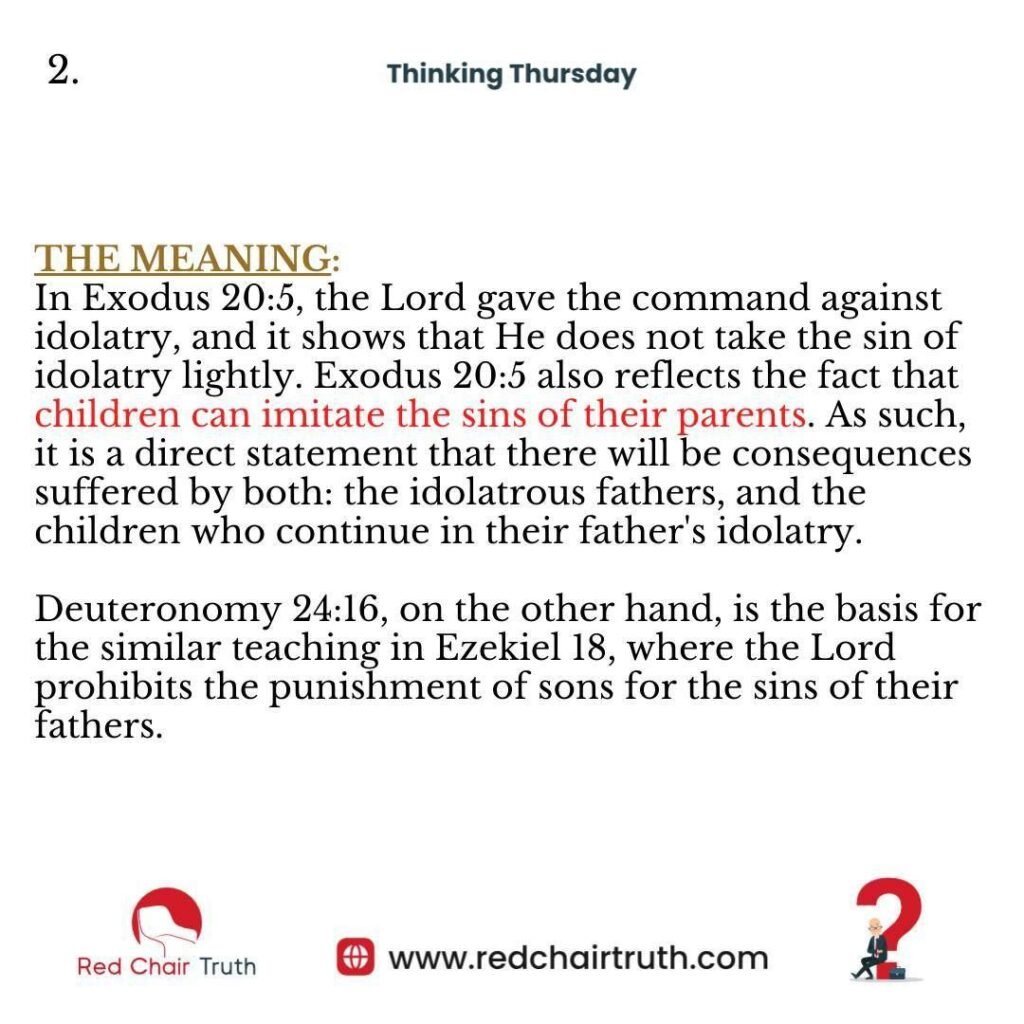 Exodus 20:5-6 speaks of the generational impacts of sin and righteousness. It does not mean that children are directly punished for the sins of their parents in a legal sense, but rather that the effects or consequences of the parents’ sins (especially idolatry) can affect future generations.