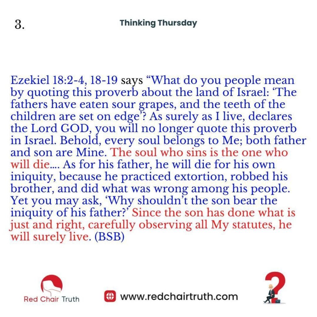 Ezekiel 18:2-4, 18-19 says “What do you people mean by quoting this proverb about the land of Israel: ‘The fathers have eaten sour grapes, and the teeth of the children are set on edge’? As surely as I live, declares the Lord GOD, you will no longer quote this proverb in Israel. Behold, every soul belongs to Me; both father and son are Mine. The soul who sins is the one who will die…. As for his father, he will die for his own iniquity, because he practiced extortion, robbed his brother, and did what was wrong among his people. Yet you may ask, ‘Why shouldn’t the son bear the iniquity of his father?’ Since the son has done what is just and right, carefully observing all My statutes, he will surely live. (BSB)
