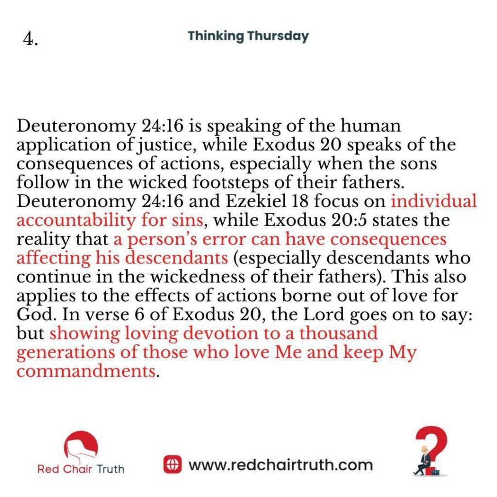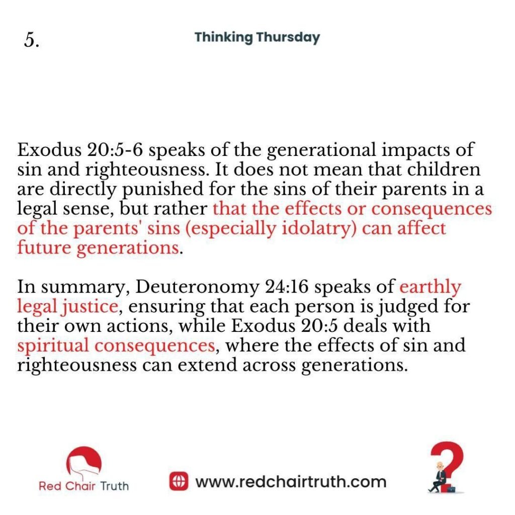 In summary, Deuteronomy 24:16 speaks of earthly legal justice, ensuring that each person is judged for their own actions, while Exodus 20:5 deals with spiritual consequences, where the effects of sin and righteousness can extend across generations.