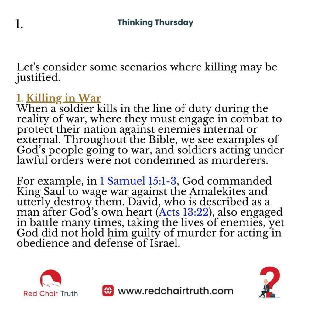 When a soldier kills in the line of duty during the reality of war, where they must engage in combat to protect their nation against enemies internal or external. Throughout the Bible, we see examples of God’s people going to war, and soldiers acting under lawful orders were not condemned as murderers.