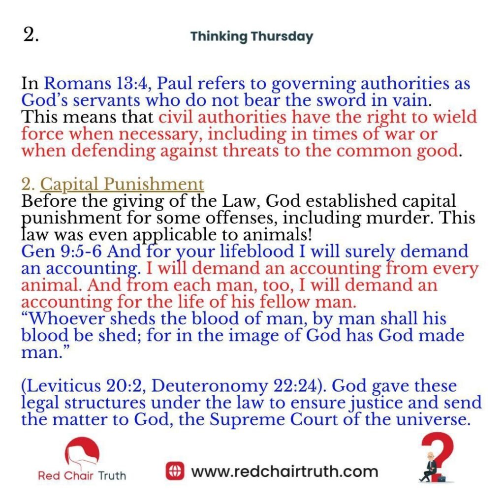 In Romans 13:4, Paul refers to governing authorities as God’s servants who do not bear the sword in vain. This means that civil authorities have the right to wield force when necessary, including in times of war or when defending against threats to the common good.