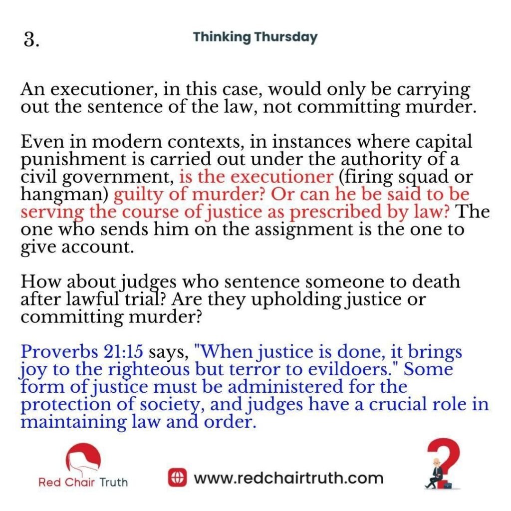 (Leviticus 20:2, Deuteronomy 22:24). God gave these legal structures under the law to ensure justice and send the matter to God, the Supreme Court of the universe. An executioner, in this case, would only be carrying out the sentence of the law, not committing murder.