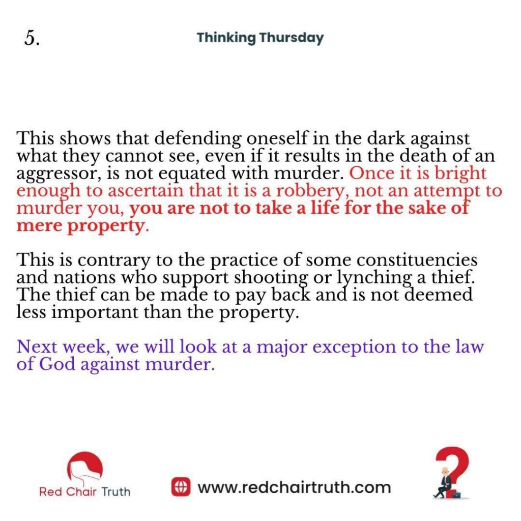 This is contrary to the practice of some constituencies and nations that support killing a thief by shooting or lynching. The thief can be made to pay back and is not deemed less important than the property.