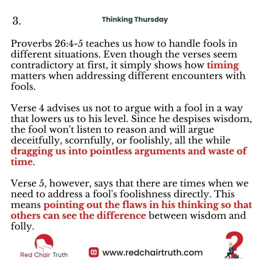 Verse 4 advises us not to argue with a fool in a way that lowers us to his level. Since he despises wisdom, the fool won’t listen to reason and will argue deceitfully, scornfully, or foolishly, all the while dragging us into pointless arguments and waste of time.