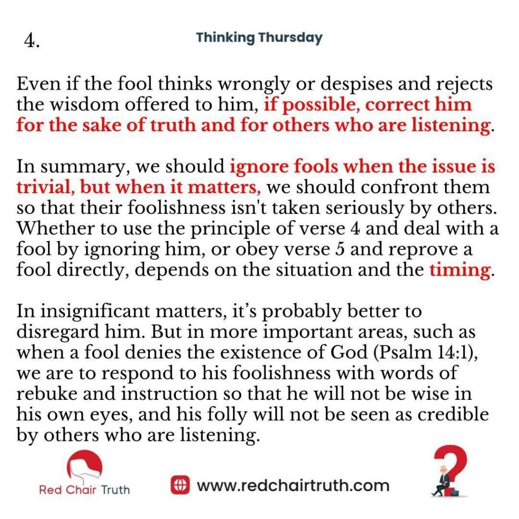Verse 5, however, says that there are times when we need to address a fool’s foolishness directly. This means pointing out the flaws in his thinking so that others can see the difference between wisdom and folly. Even if the fool thinks wrongly or despises and rejects the wisdom offered to him, if possible, correct him for the sake of truth and for others who are listening.