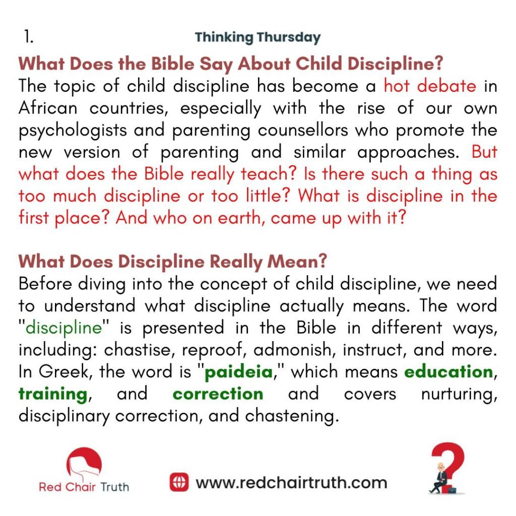 The topic of child discipline has become a hot debate in African countries, especially with the rise of our own psychologists and parenting counsellors who promote the new version of parenting and similar approaches. But what does the Bible really teach? Is there such a thing as too much discipline or too little? What is discipline in the first place? And who on earth came up with it?