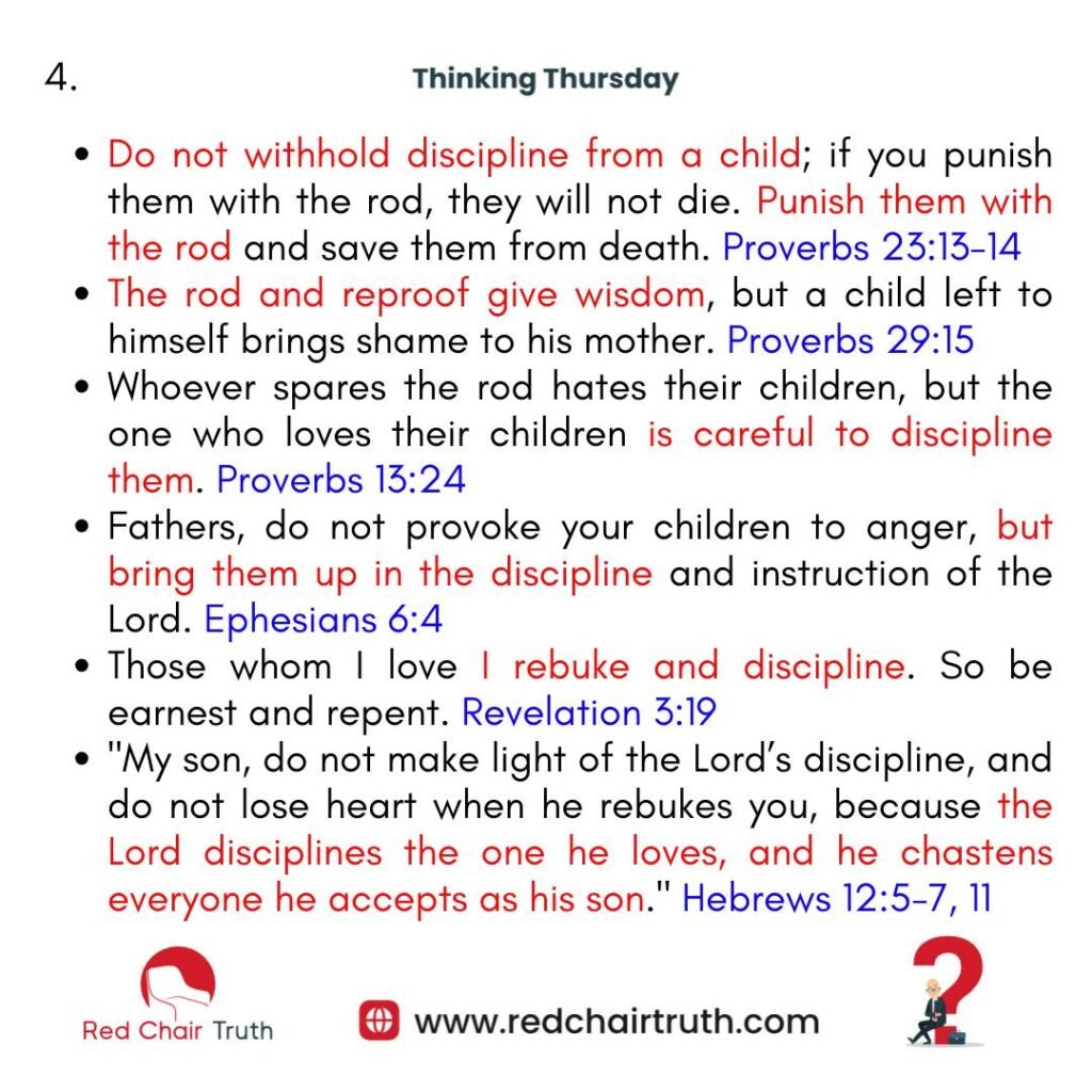 Proverbs 23:13-14 – Do not withhold discipline from a child; if you punish them with the rod, they will not die. Punish them with the rod and save them from death.