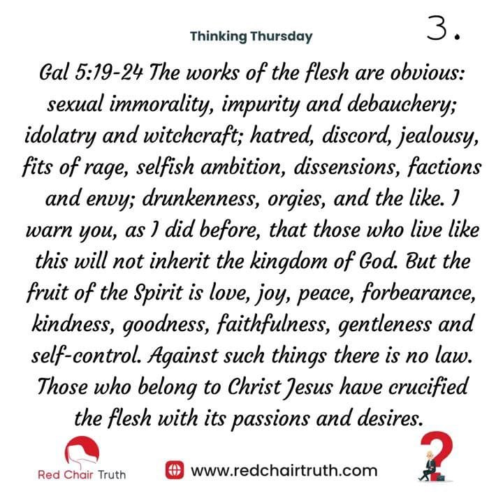 Gal 5:19-24 The works of the flesh are obvious: sexual immorality, impurity and debauchery; idolatry and witchcraft; hatred, discord, jealousy, fits of rage, selfish ambition, dissensions, factions and envy; drunkenness, orgies, and the like. I warn you, as I did before, that those who live like this will not inherit the kingdom of God. But the fruit of the Spirit is love, joy, peace, forbearance, kindness, goodness, faithfulness, gentleness and self-control. Against such things, there is no law. Those who belong to Christ Jesus have crucified the flesh with its passions and desires.