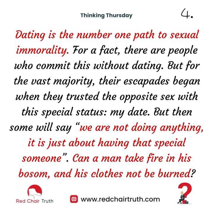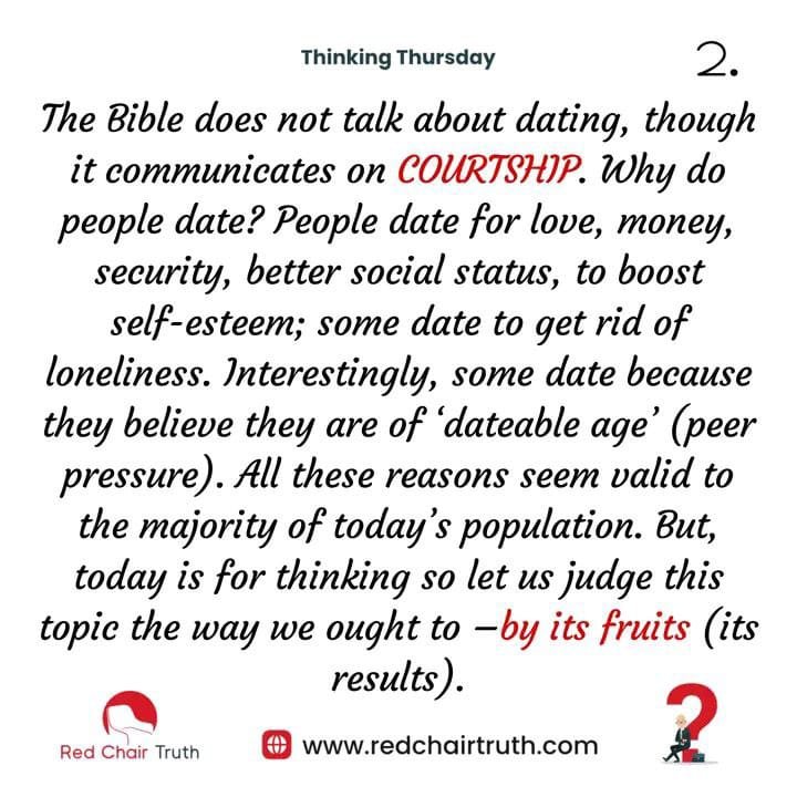 The Bible does not talk about dating, though it communicates on COURTSHIP. Why do people date? People date for love, money, security, better social status, to boost self-esteem; some date to get rid of loneliness. Interestingly, some date because they believe they are of ‘dateable age’ (peer pressure). All these reasons seem valid to the majority of today’s population. But, today is for thinking so let us judge this topic the way we ought to – by its fruits (its results).