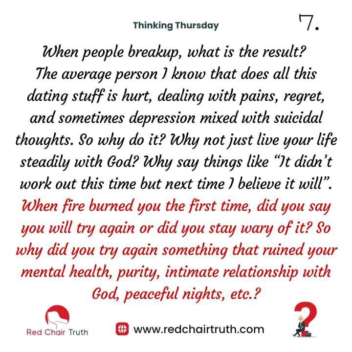 When people breakup, what is the result? The average person I know that does all this dating stuff is hurt, dealing with pains, regret, and sometimes depression mixed with suicidal thoughts. So why do it? Why not just live your life steadily with God? Why say things like “It didn’t work out this time but next time I believe it will”. When fire burned you the first time, did you say you will try again or did you stay wary of it? So why did you try again something that ruined your mental health, purity, intimate relationship with God, peaceful nights, etc.?