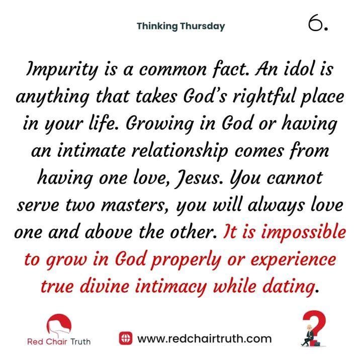 Impurity is a common fact. An idol is anything that takes God’s rightful place in your life. Growing in God or having an intimate relationship comes from having one love, Jesus. You cannot serve two masters, you will always love one and above the other. It is impossible to grow in God properly or experience true divine intimacy while dating.