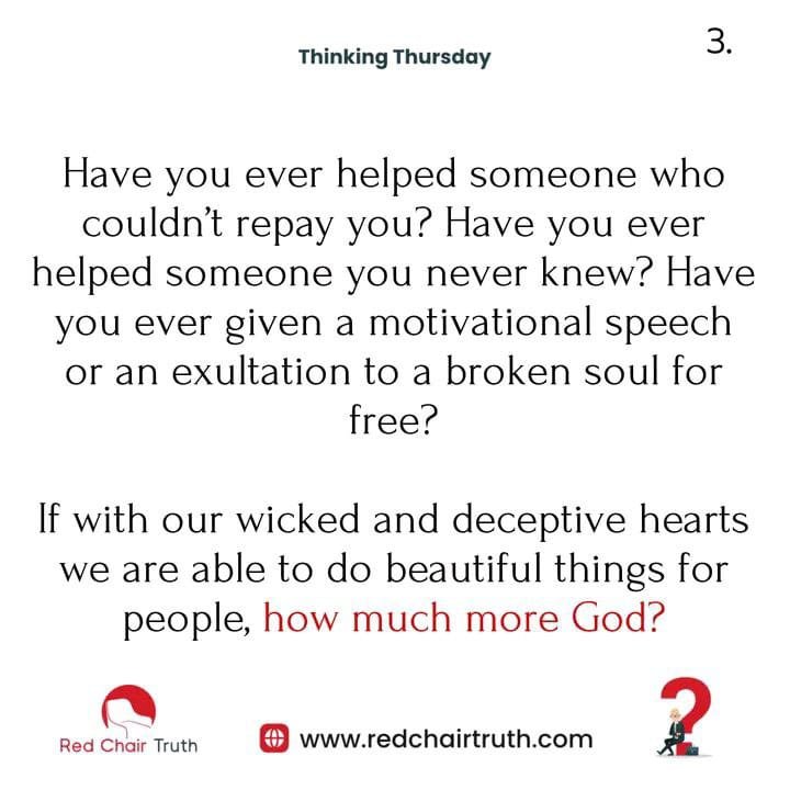 If with our wicked and deceptive hearts we are able to do beautiful things for people, how much more God?Did you really think the Most High God who made the Heavens and Earth needs your money to show you kindness or Mercy?