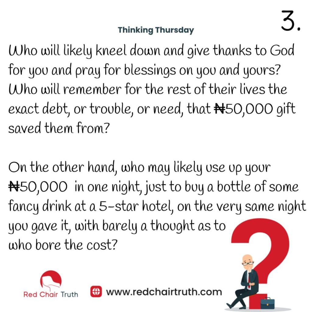 On the other hand, who may likely use up your N50,000 in one night, just to buy a bottle of some fancy drink at a 5-star hotel, on the very same night you gave it, with barely a thought as to who bore the cost?
