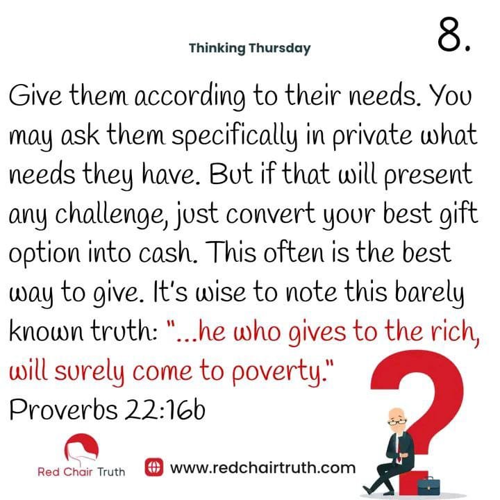 Giving to them according to their needs is the ‘God way’ to give. You may ask them specifically in private what needs they have. But if that will present any challenge, just convert your best gift option into cash. This often is the best way to give. It’s wise to note this barely known truth: “…he who gives to the rich, will surely come to poverty.” Proverbs 22:16b