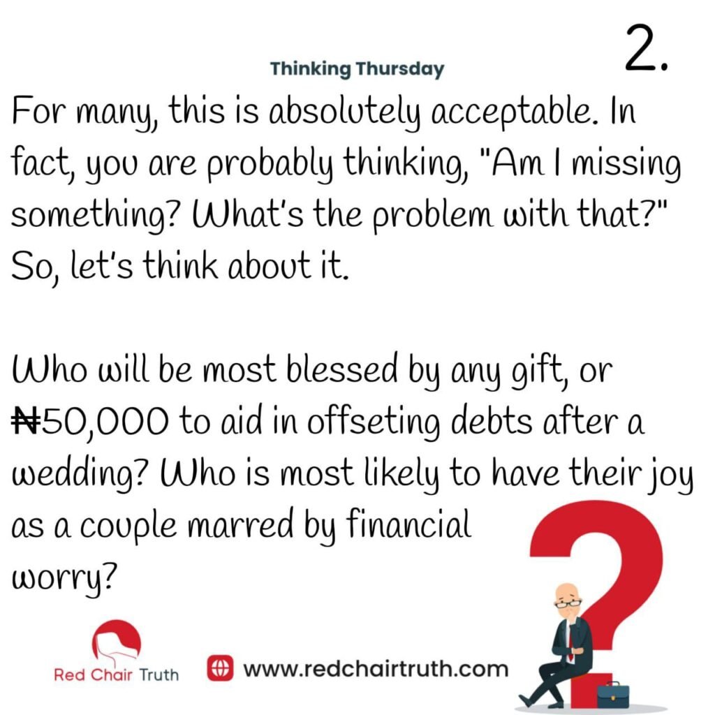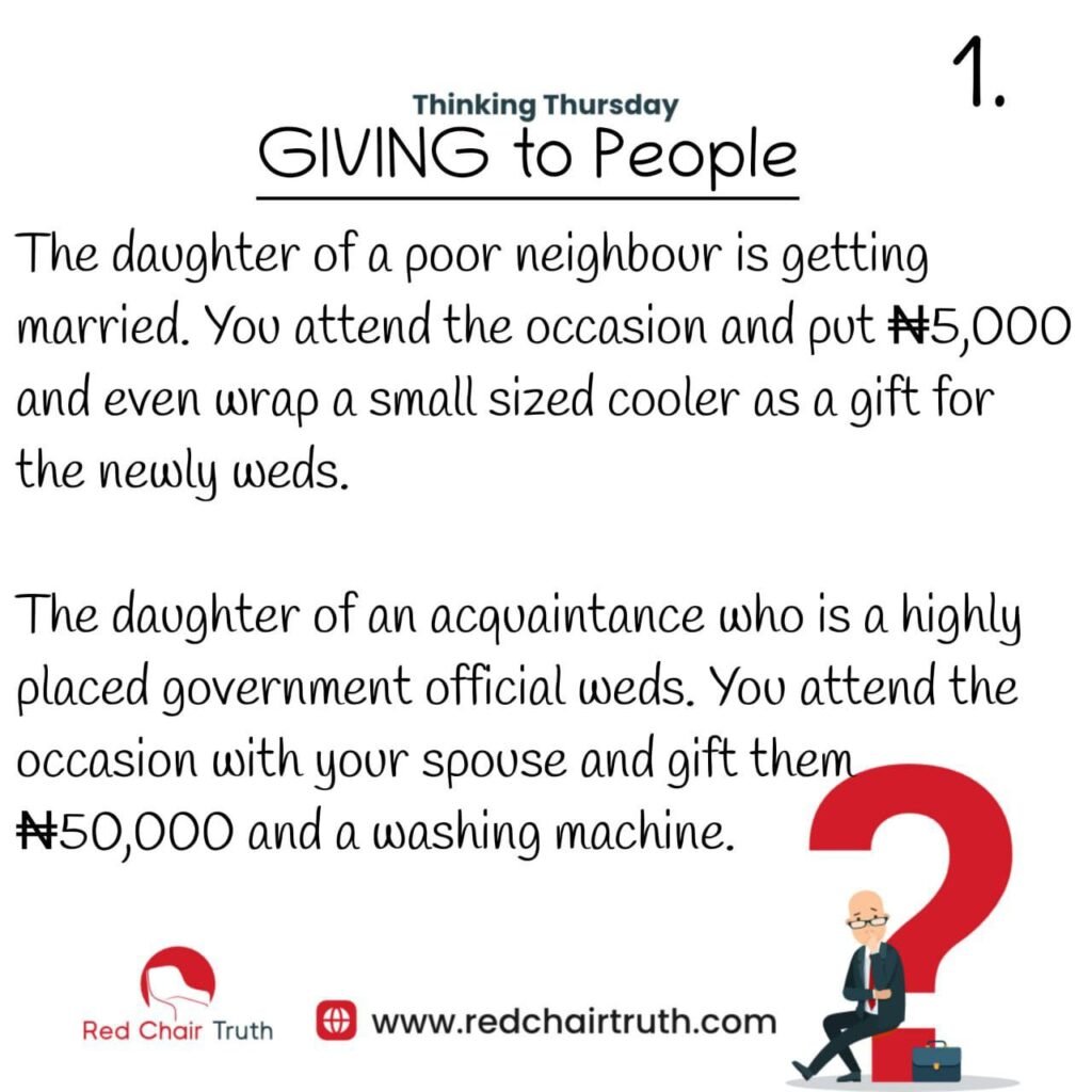 The daughter of a poor neighbour is getting married. You attend the occasion and put #5,000 and even wrap a small-sized cooler as a gift for the newlyweds.