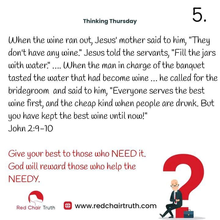 When the wine ran out, Jesus’ mother said to him, “They don’t have any wine.” Jesus told the servants, “Fill the jars with water….. When the man in charge of the banquet tasted the water that had become wine… he called for the bridegroom and said to him, “Everyone serves the best wine first, and the cheap kind when people are drunk. But you have kept the best wine until now!” John 2:9-10
