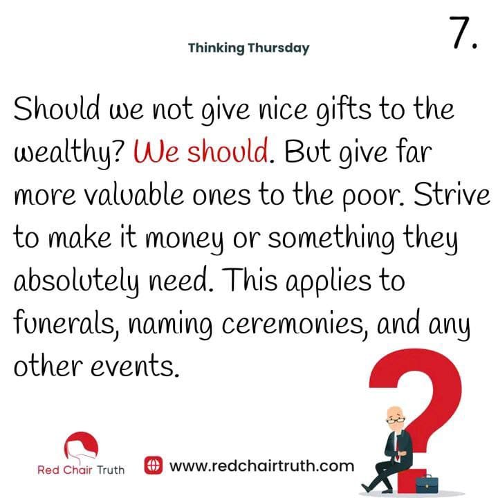 Should we not give nice gifts to the wealthy? We should. But give far more valuable ones to the poor. Strive to make it money or something they absolutely need. This applies to funerals, naming ceremonies, and any other events.