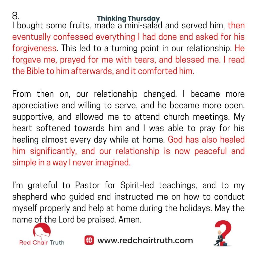 I bought some fruits, made a mini-salad and served him, then eventually confessed everything I had done and asked for his forgiveness. This led to a turning point in our relationship. He forgave me, prayed for me with tears, and blessed me. I read the Bible to him afterwards, and it comforted him.