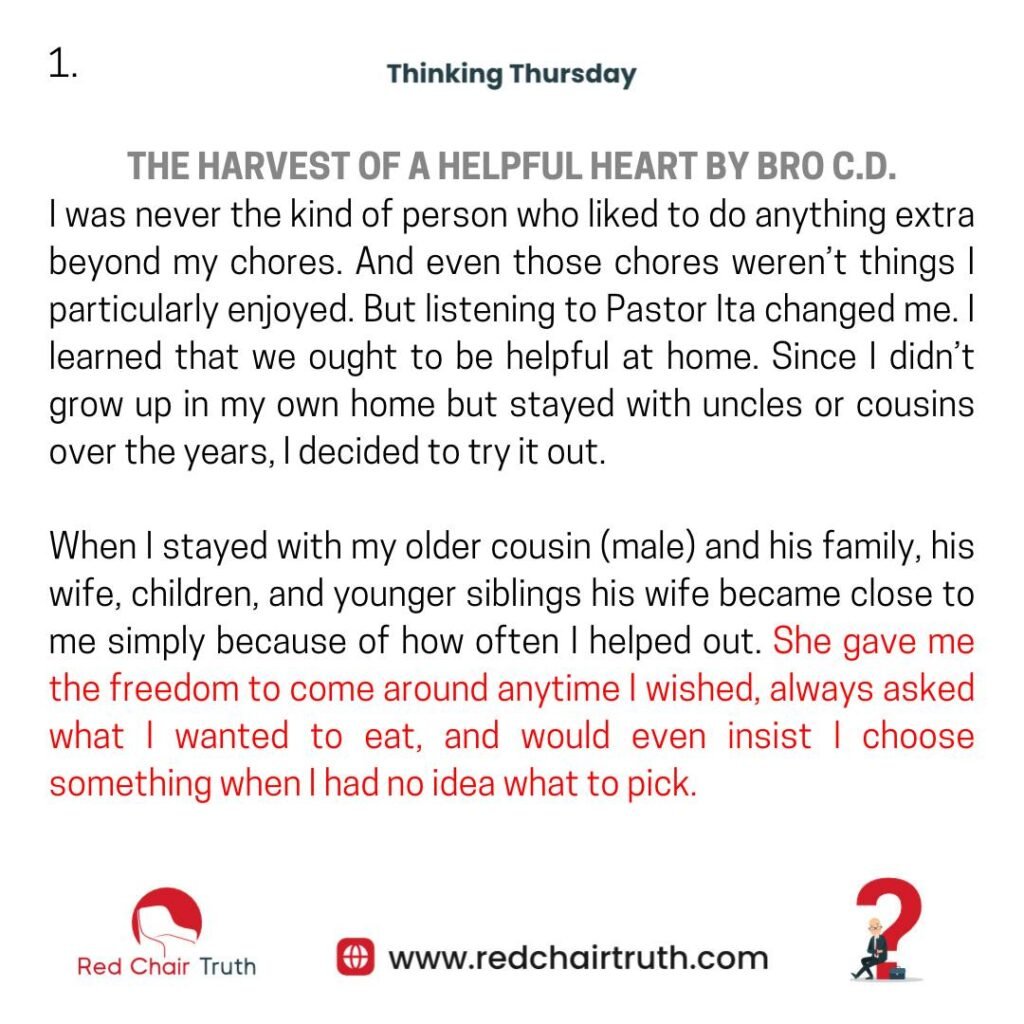 I was never the kind of person who liked to do anything extra beyond my chores. And even those chores weren’t things I particularly enjoyed. But listening to Pastor Ita changed me. I learned that we ought to be helpful at home. Since I didn’t grow up in my own home but stayed with uncles or cousins over the years, I decided to try it out.