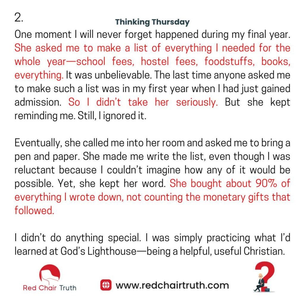One moment I will never forget happened during my final year. She asked me to make a list of everything I needed for the whole year—school fees, hostel fees, foodstuffs, books, everything. It was unbelievable. The last time anyone asked me to make such a list was in my first year when I had just gained admission. So I didn’t take her seriously. But she kept reminding me. Still, I ignored it.