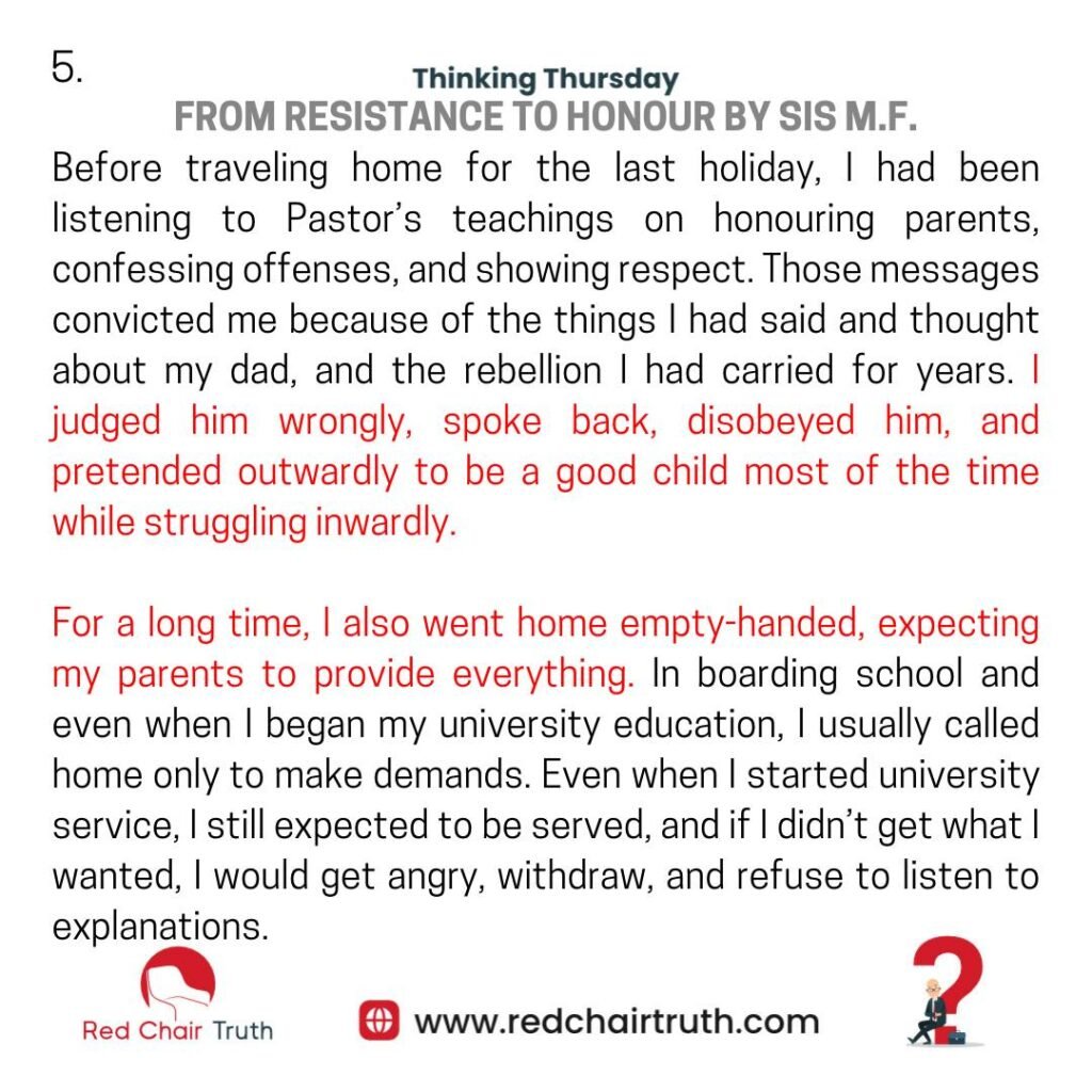 Pride kicked in, and I became disobedient—refusing errands or telling my parents to send my siblings instead. But because of the teachings on honour, it was easy for the Holy Spirit to convict me. I found myself apologizing, repenting, and choosing to obey.
