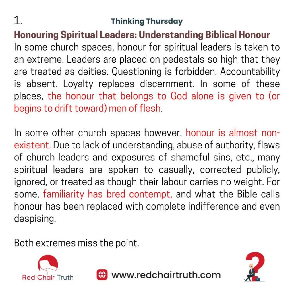 In some church spaces, honour for spiritual leaders is taken to an extreme. Leaders are placed on pedestals so high that they are treated as deities. Questioning is forbidden. Accountability is absent. Loyalty replaces discernment. In some of these places, the honour that belongs to God alone is given to (or begins to drift toward) men of flesh.