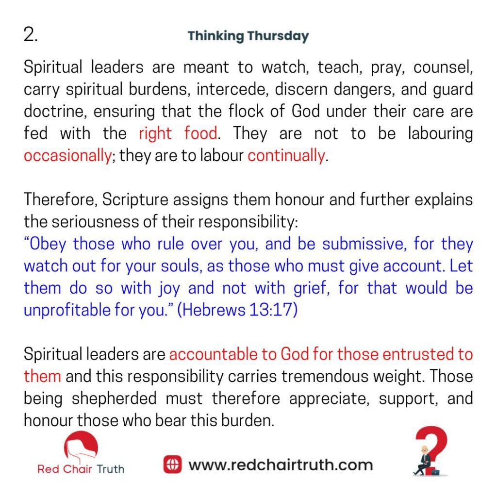 Spiritual leaders are meant to watch, teach, pray, counsel, carry spiritual burdens, intercede, discern dangers, and guard doctrine, ensuring that the flock of God under their care are fed with the right food. They are not to be labouring occasionally; they are to labour continually.