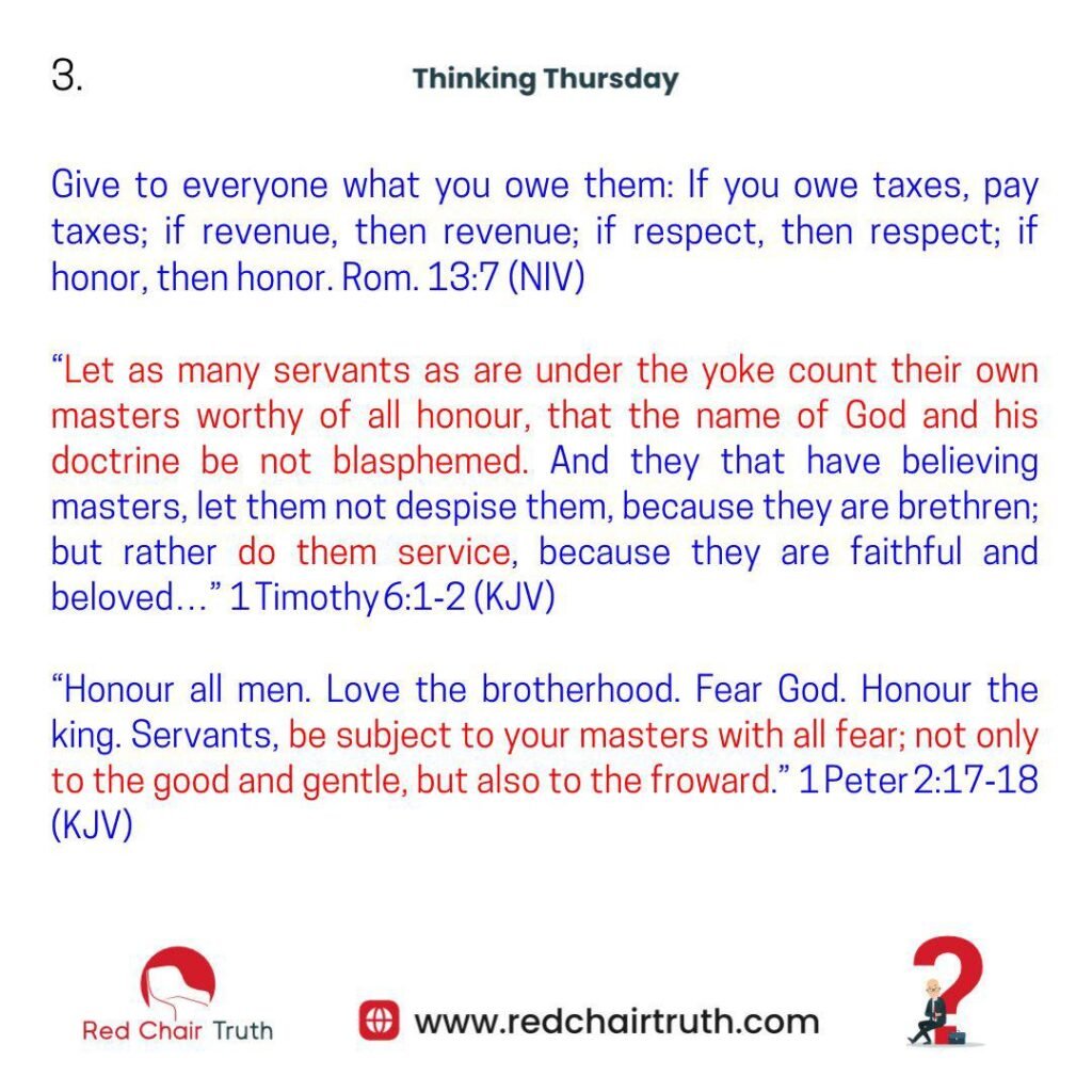 “Let as many servants as are under the yoke count their own masters worthy of all honour, that the name of God and his doctrine be not blasphemed. And they that have believing masters, let them not despise them, because they are brethren; but rather do them service, because they are faithful and beloved…” 1 Timothy 6:1-2 (KJV)